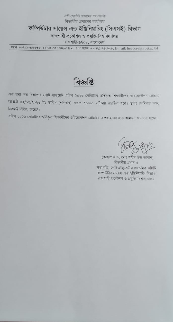 Registrar Mr. Arif Ahmed Chowdhury departed for Dhaka on the afternoon of 19/04/2026 for official work.